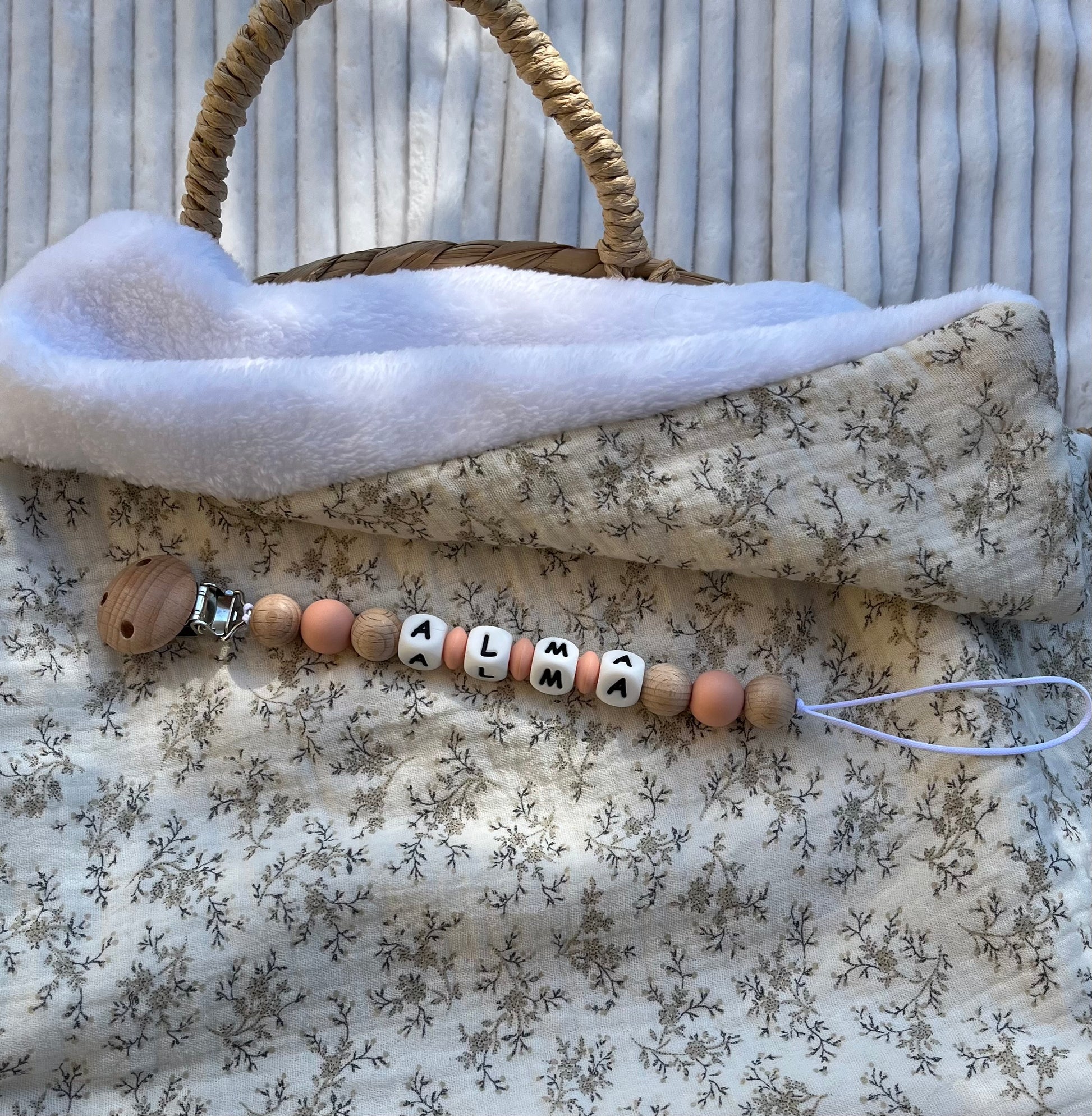 ⚠️ Pour des raisons de sécurité, l’attache tétine ne doit pas dépasser 22cm, le nombre de perles sera donc adapté en fonction du nombre de lettres du prénom de bébé